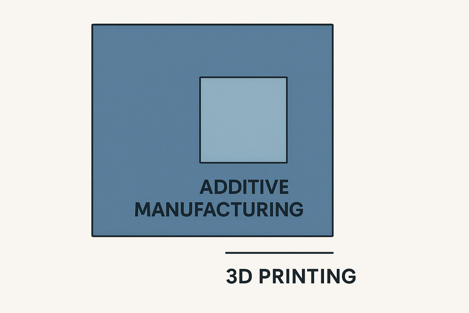 بنابراین ، هنگامی که شخصی به چاپ سه بعدی اشاره می کند ، روشی را توصیف می کند که ذاتاً تولید افزودنی را انجام می دهد. با این حال ، هنگام بحث در مورد تولید افزودنی ، شامل طیف وسیع تری از فناوری ها ، مواد و برنامه های پیشرفته ای است که بسیار فراتر از آنچه عموم مردم به طور معمول با "چاپ سه بعدی" ارتباط دارند. اصطلاح "تولید افزودنی" بر هدف صنعتی ، دقت و قابلیت های عملکردی برای کاربردهای مهم تأکید می کند ، در حالی که "چاپ سه بعدی" اغلب مفهوم عمومی تر از ایجاد لایه اشیاء سه بعدی را به صورت لایه برجسته می کند.