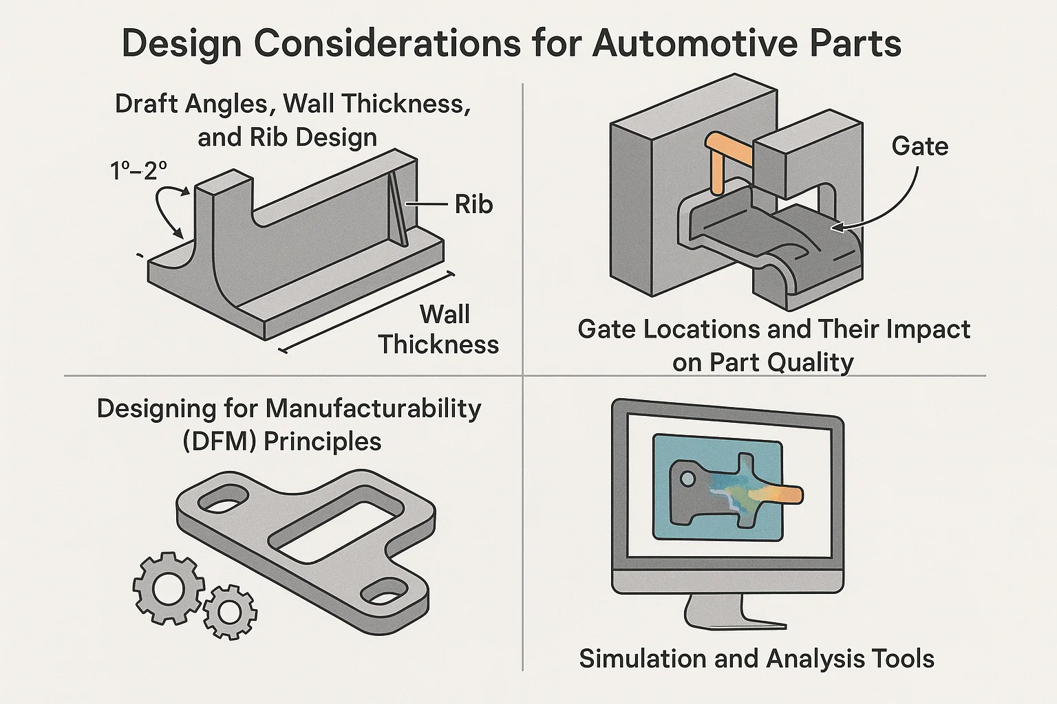 موفقیت قطعات خودروهای قالب ریزی شده و بیش از حد تزریق شده به یک فرآیند طراحی دقیق وابسته است. یک قسمت خوب طراحی شده نه تنها کاربردی بلکه قابل تولید ، بادوام و مقرون به صرفه است. پایبندی به اصول طراحی اساسی برای جلوگیری از موضوعات مشترک مانند پیچ و تاب ، پیوندهای ضعیف و نقص های آرایشی بسیار مهم است.
