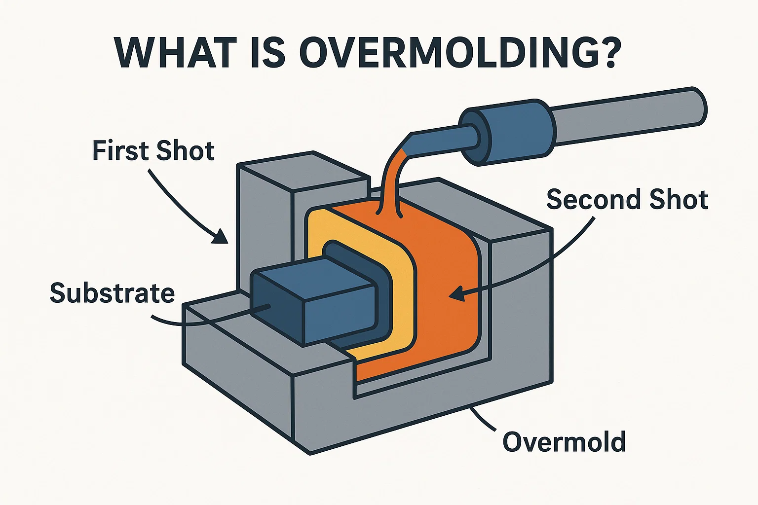 Overmolding یک فرآیند دو مرحله ای متوالی است که در آن ماده دوم بر روی یک قسمت جامد و از قبل موجود قالب ریزی می شود. این ایده آل برای اضافه کردن یک لایه نرم به یک پایه سفت و سخت است.