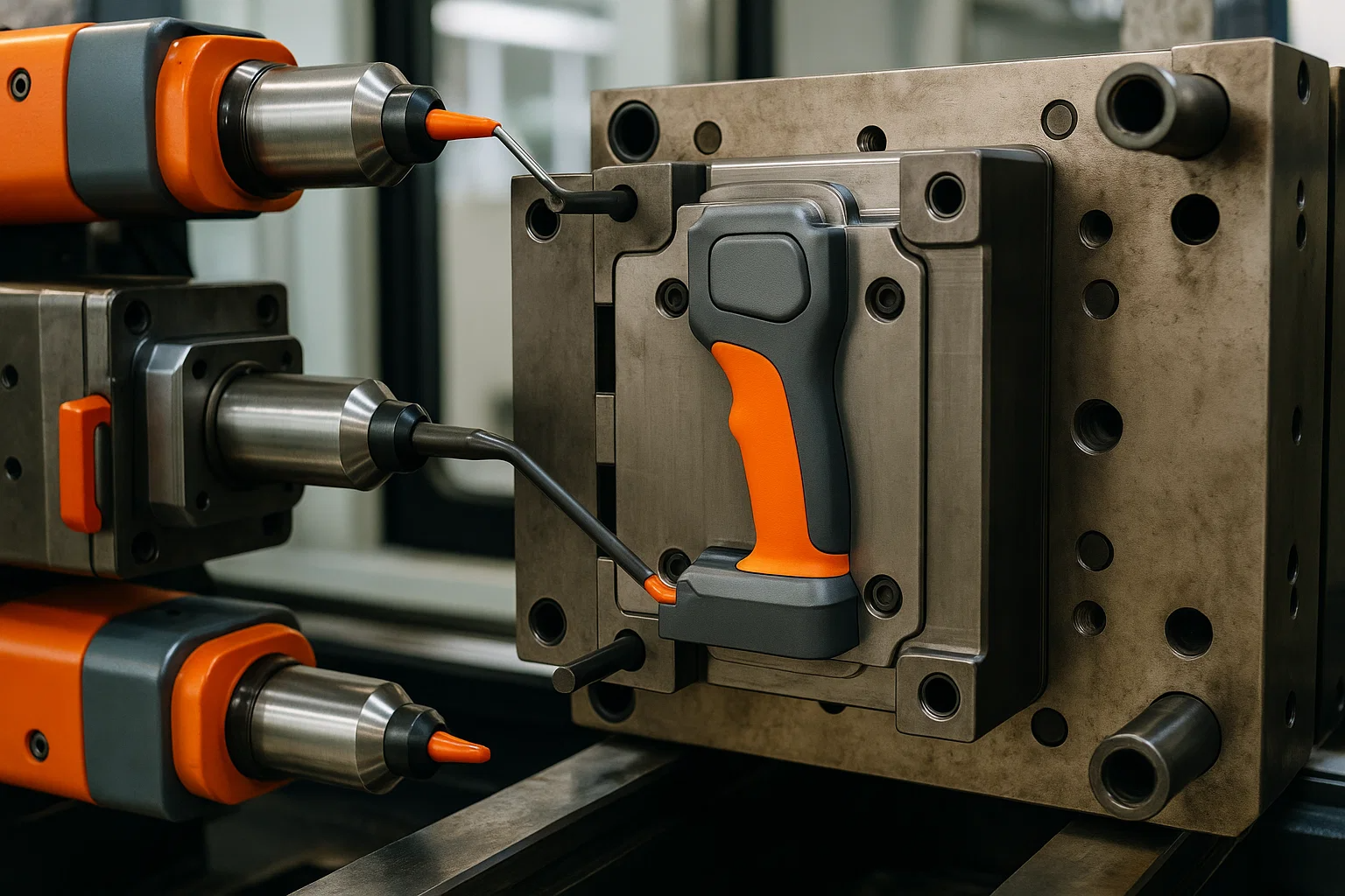 راه حل: سازنده پیاده سازی کرد بیش از حد با استفاده از یک فرآیند قالب گیری تزریق دو شات. ابتدا بدنه دسته ساختاری از پلاستیک ABS با دوام و سفت و سخت ساخته شده است. این "بستر" سفت و سخت سپس در همان دستگاه قالب گیری به یک حفره دوم چرخانده شد. در اینجا ، یک ولگرد ترموپلاستیک نرم و الاستومریک (TPV) در مناطق خاص دسته ABS تزریق شد و یک چنگال راحت و بدون لغزش را تشکیل داد.