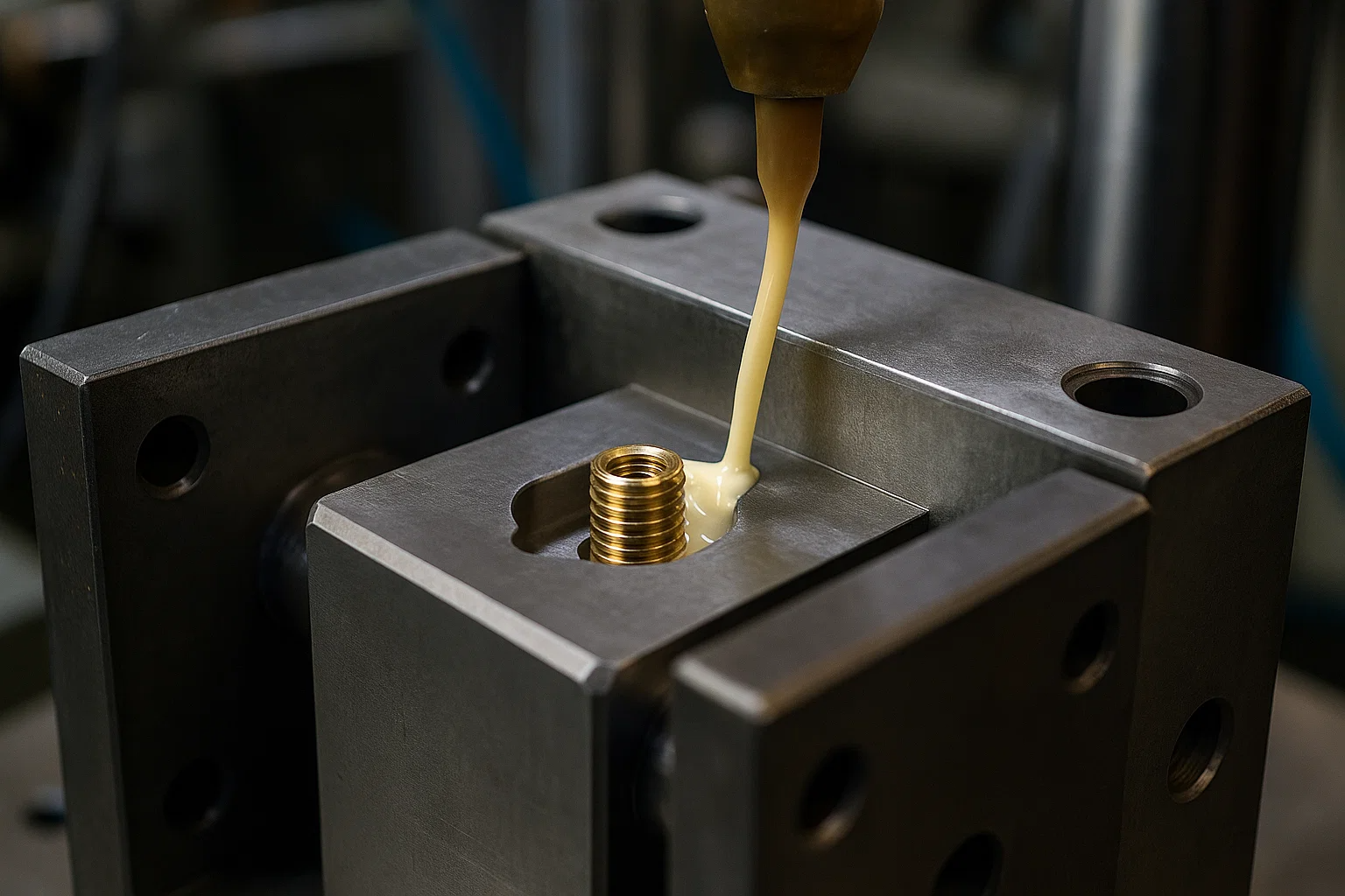 تزریق مواد: پلاستیک مذاب (ترموپلاستیک یا ترموز) تحت فشار زیاد به داخل حفره قالب تزریق می شود و در اطراف آن جاری می شود و درج ها را محاصره می کند. این ماده تمام حفره ها را پر می کند و یک پیوند قوی یا قفل مکانیکی با درج ایجاد می کند.