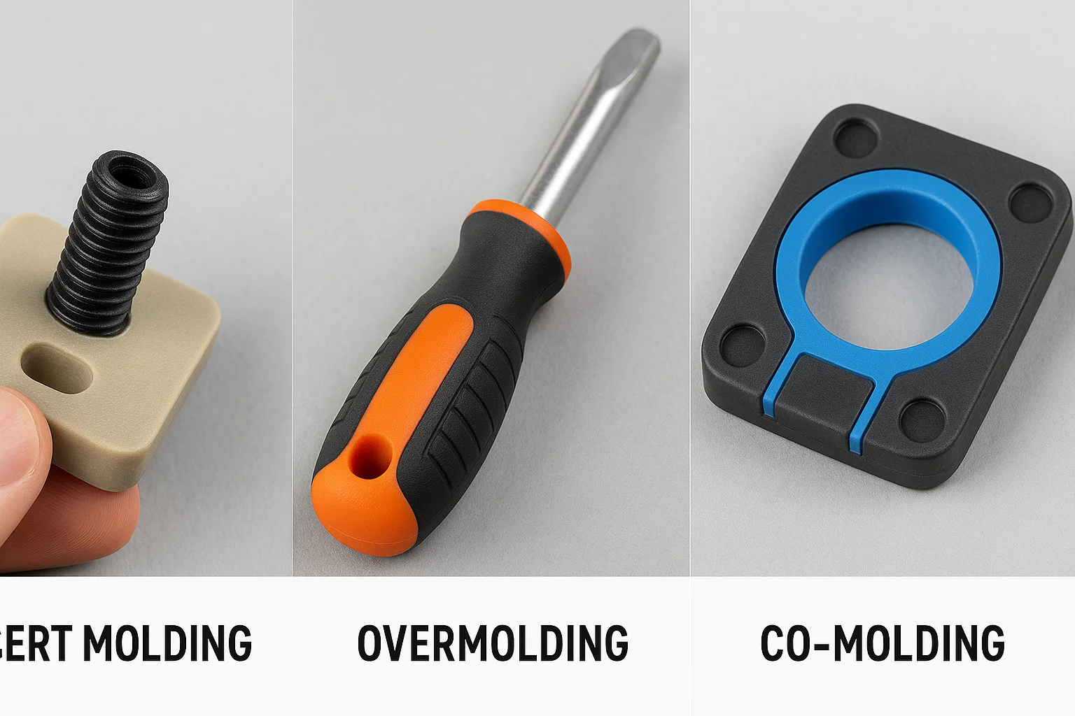 | تعریف | قالب گیری پلاستیک در اطراف یک جزء غیر پلاستیک یا از قبل موجود (درج). | قالب گیری یک ماده دوم (اغلب نرمتر/متفاوت) بر روی یک قسمت پلاستیکی موجود (بستر). | قالب گیری دو یا چند ماده متفاوت در یک قسمت واحد در یک چرخه قالب گیری. |