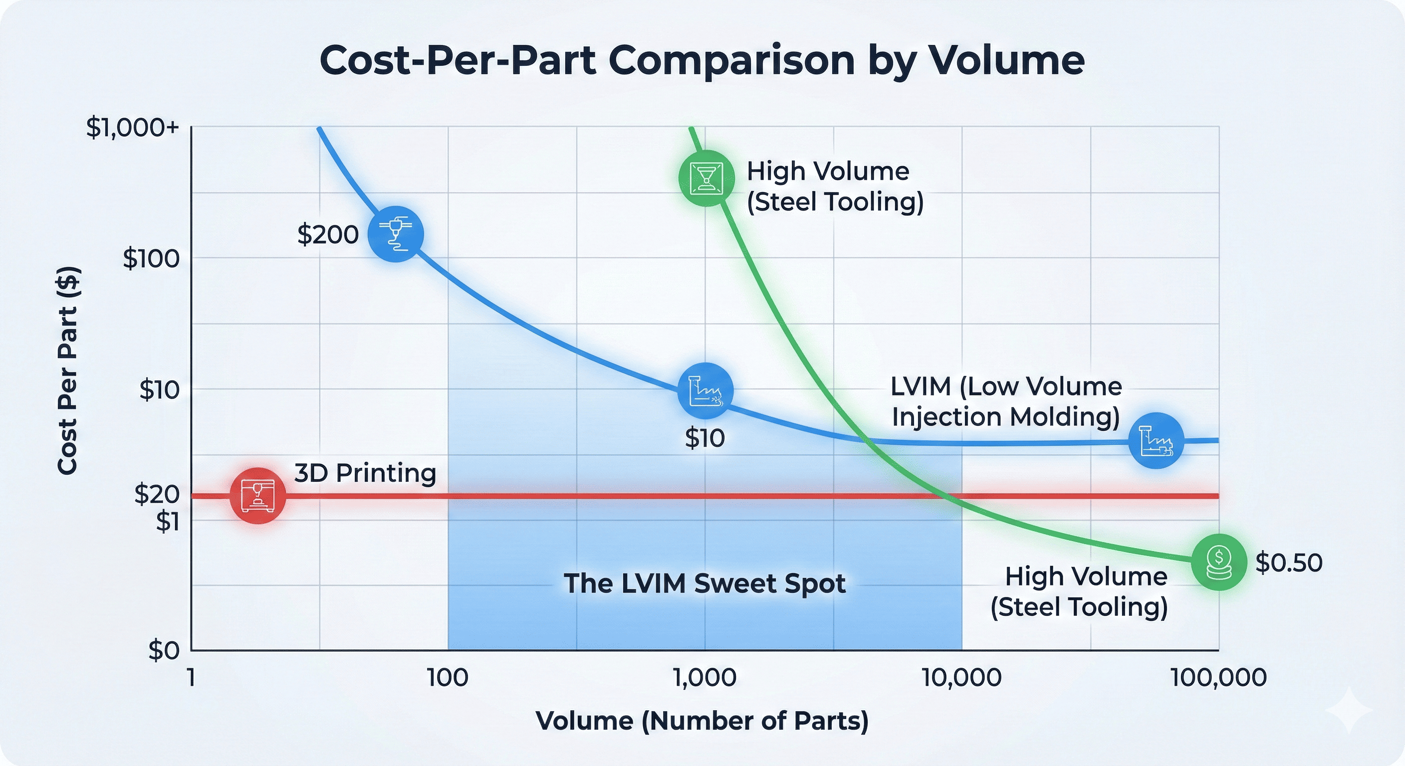 به این موضوع فکر کنید: پرینت سه بعدی مانند سوار شدن به تاکسی است. برای یک سفر کوتاه راحت است، اما برای رانندگی در سراسر کشور از آن استفاده نمی کنید. قالب گیری تزریقی کم حجم مانند اجاره خودرو است. در ابتدا کمی کاغذبازی و پیش پرداخت (هزینه قالب) وجود دارد، اما پس از آن، هر مایل - یا هر قسمت - به طور قابل توجهی ارزان تر است.