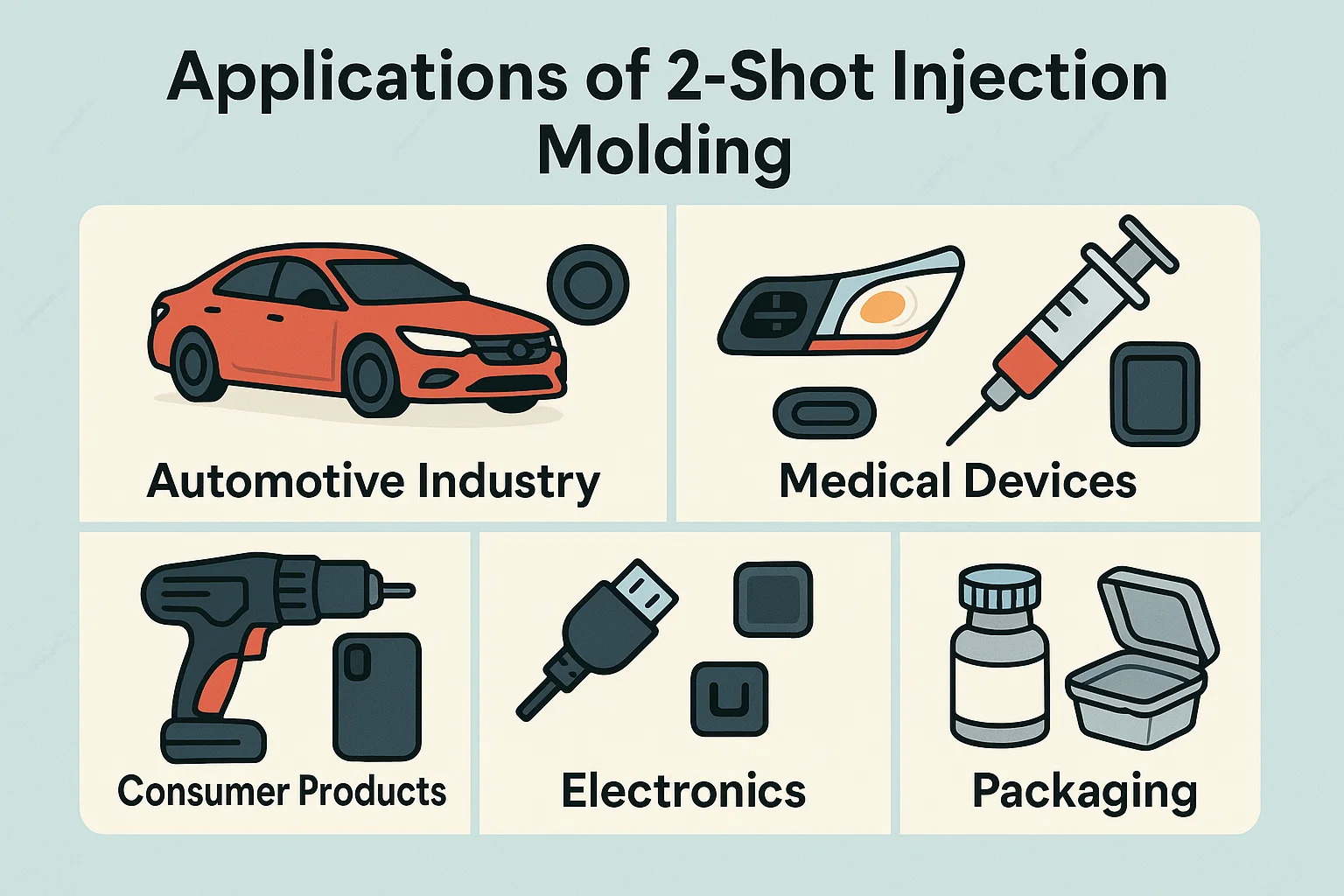 ترکیبی منحصر به فرد از عملکرد ، زیبایی شناسی و کارآیی ارائه شده توسط قالب تزریق 2 شات ، آن را به یک روش تولید ترجیح می دهد در طیف گسترده ای از صنایع. توانایی آن در ایجاد یک قسمت واحد و چند ماده در یک چرخه ، چالش های پیچیده طراحی و مونتاژ را حل کرده است و منجر به افزایش کیفیت و عملکرد محصول در بخش های زیر می شود.