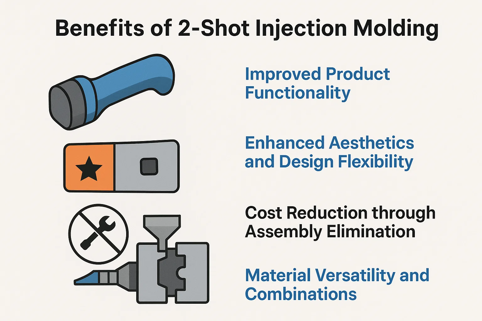یکی از مهمترین مزایای قالب گیری 2 شات ، توانایی آن در تقویت عملکرد یک محصول با ترکیب مواد با خواص مختلف است. به عنوان مثال ، یک ترموپلاستیک سفت و سخت می تواند بدنه ساختاری یک محصول را تشکیل دهد ، در حالی که یک الاستومر ترموپلاستیک نرم (TPE) روی آن غلبه می کند تا یک چنگال راحت و بدون لغزش ایجاد کند. این تکنیک برای ابزارهای برق ، الکترونیک مصرفی و ابزارهای پزشکی که ارگونومی و احساس لمسی بسیار مهم هستند ضروری است. علاوه بر این ، این فرآیند برای ایجاد مهر و موم های یکپارچه ، واشر و لولا های زنده ایده آل است که باعث افزایش دوام ، ضد آب و عملکرد کلی محصول بدون نیاز به اجزای جداگانه می شود که می توانند با گذشت زمان شکست بخورند.