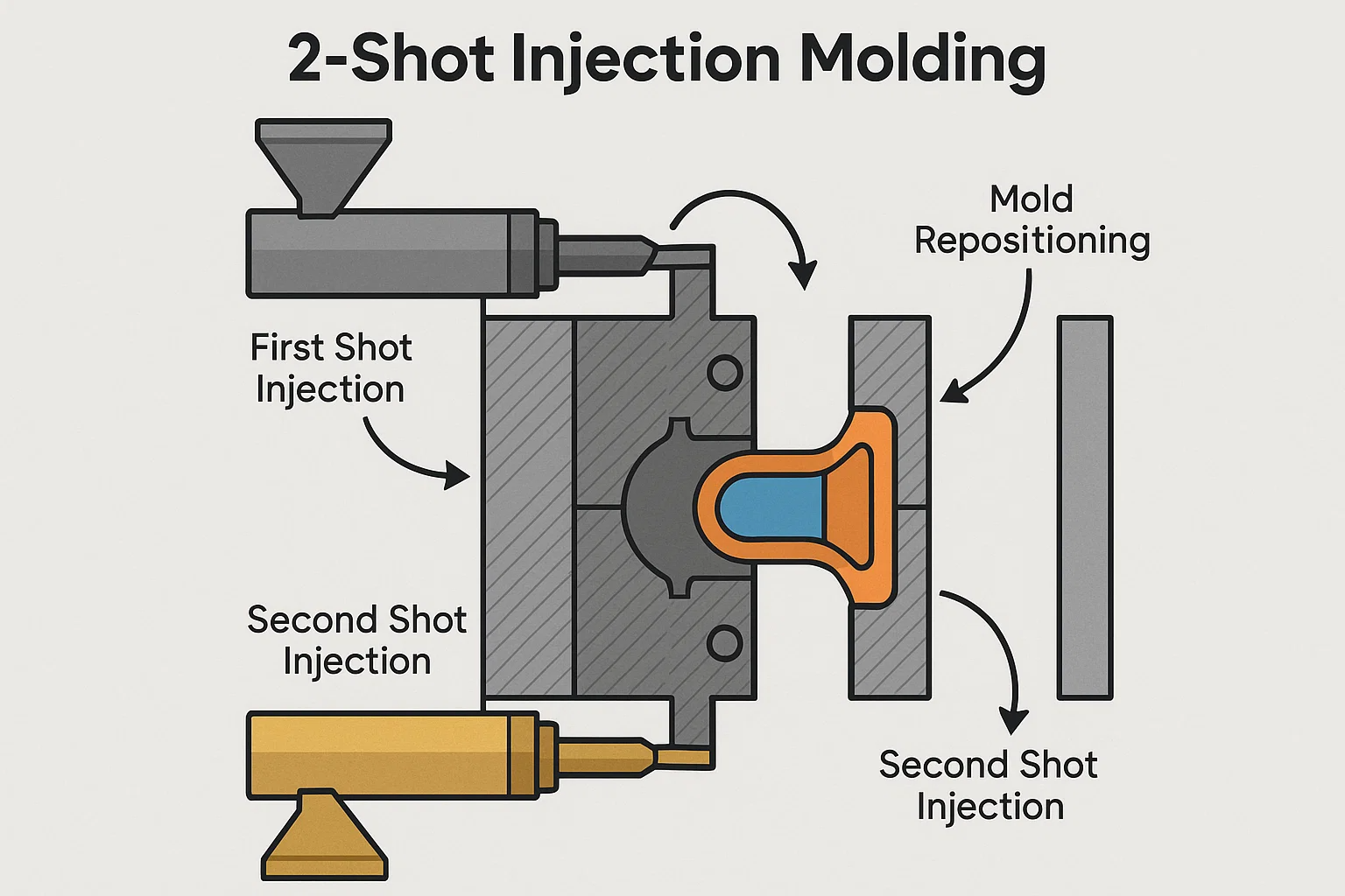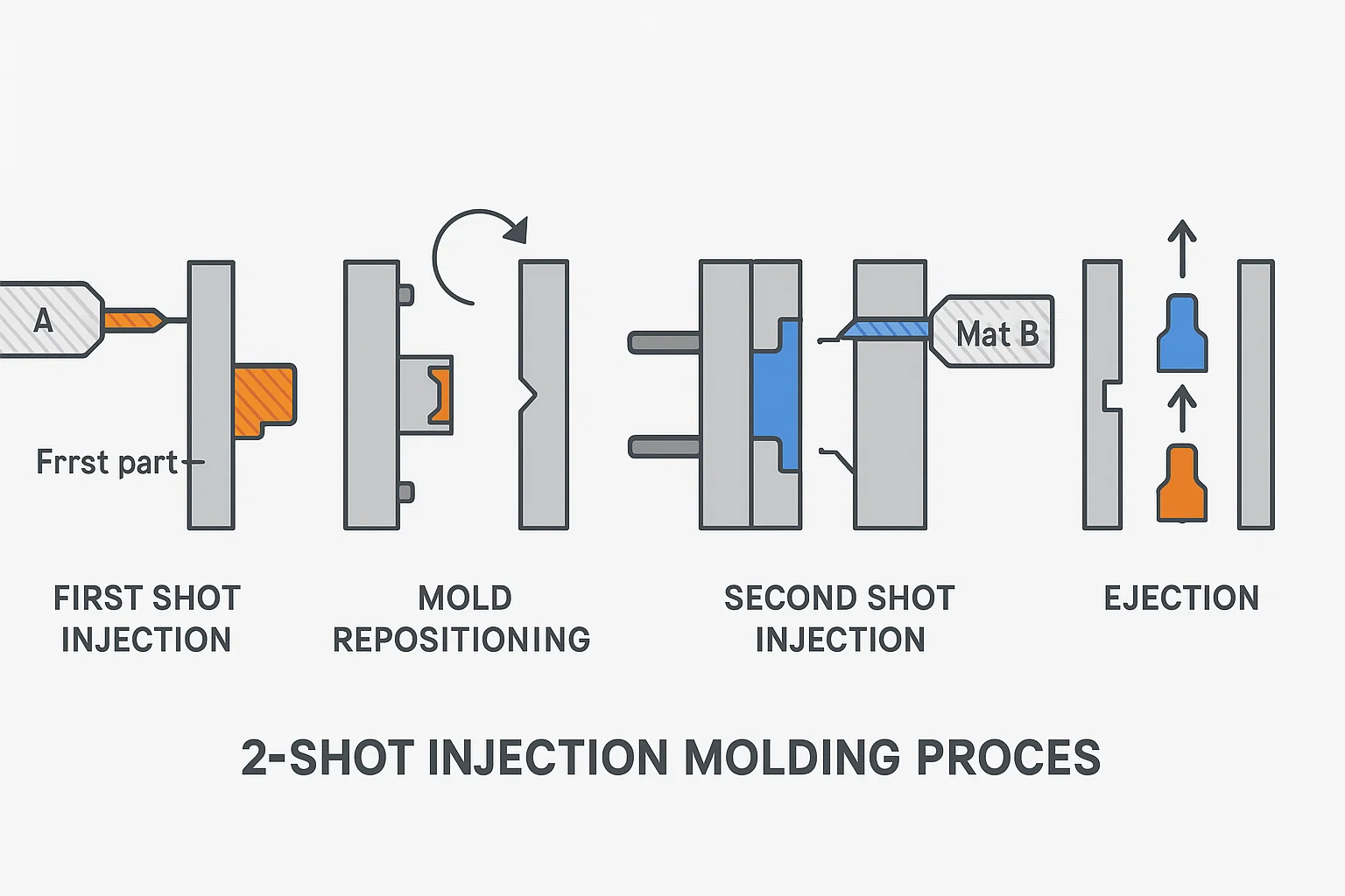 اصل اساسی قالب تزریق 2 شات تزریق متوالی دو ماده به یک قالب مخصوص طراحی شده است. این روند به طور کلی از این مراحل کلیدی پیروی می کند: