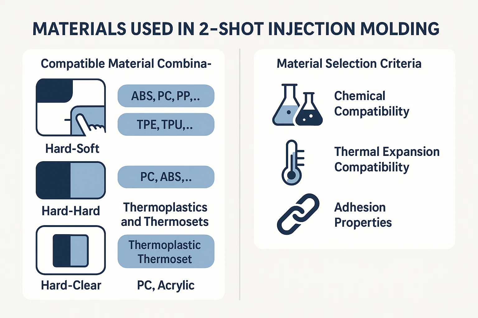 قالب گیری 2 شات دنیای گسترده ای از ترکیبات مواد را باز می کند و به مهندسان این امکان را می دهد تا خواص ایده آل را برای هر قسمت از یک مؤلفه انتخاب کنند. این فرایند محدود به پلاستیک سفت و سخت و یک چنگال نرم نیست. این می تواند دو پلاستیک سخت متفاوت ، یک پلاستیک شفاف را با یک مات یا ترموپلاستیک با ماده ترموست ترکیب کند. این تطبیق پذیری امکان ایجاد قطعاتی با هسته قوی ، سفت و سخت و نمای بیرونی با دوام ، انعطاف پذیر یا اجزای دارای عایق الکتریکی و خاصیت هدایت حرارتی را فراهم می کند. نکته اصلی انتخاب موادی است که از نظر شیمیایی و حرارتی سازگار هستند تا از پیوند قوی و قابل اعتماد اطمینان حاصل کنند.