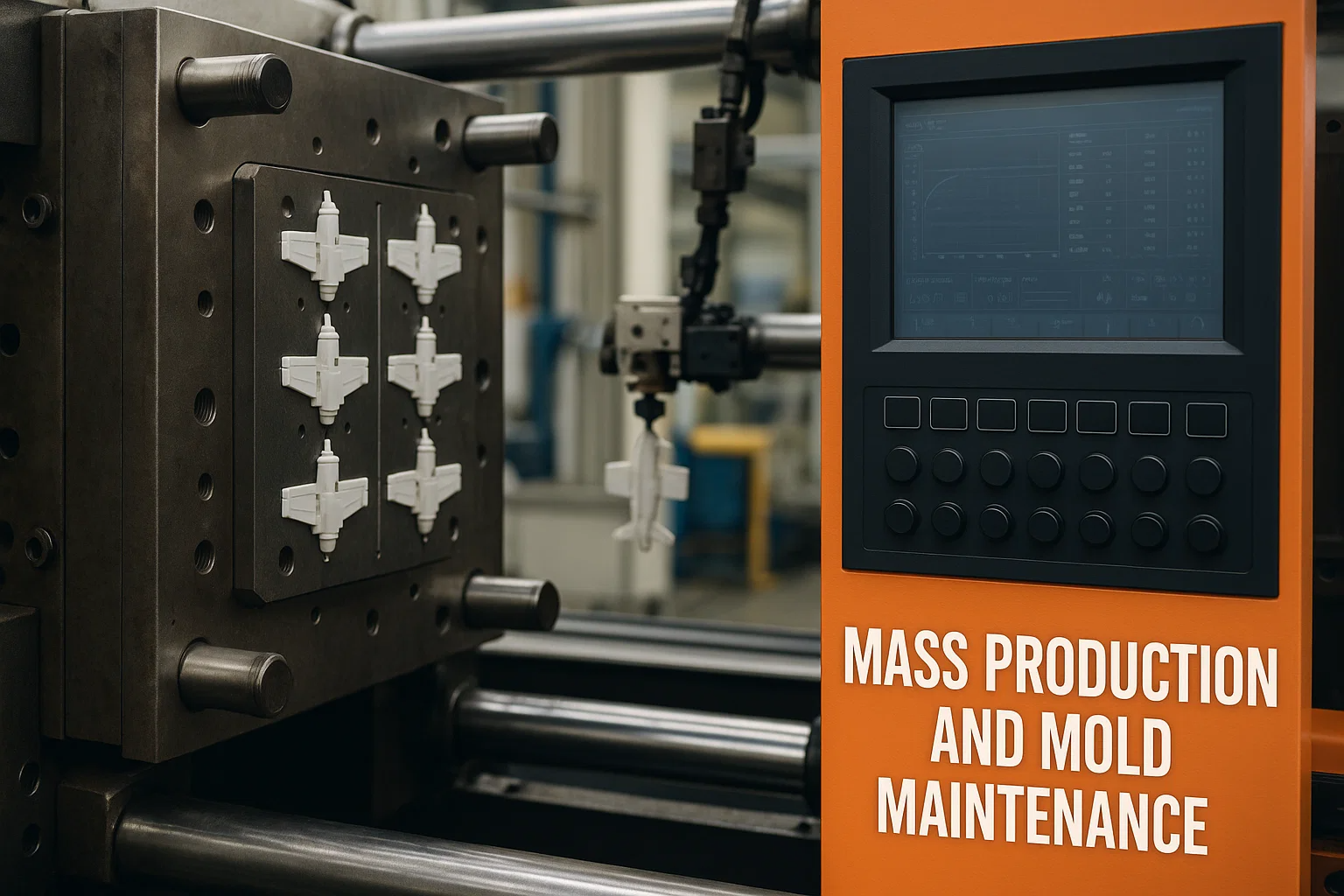 The transition to mass production involves optimizing the injection molding machine and its environment for continuous, efficient operation: