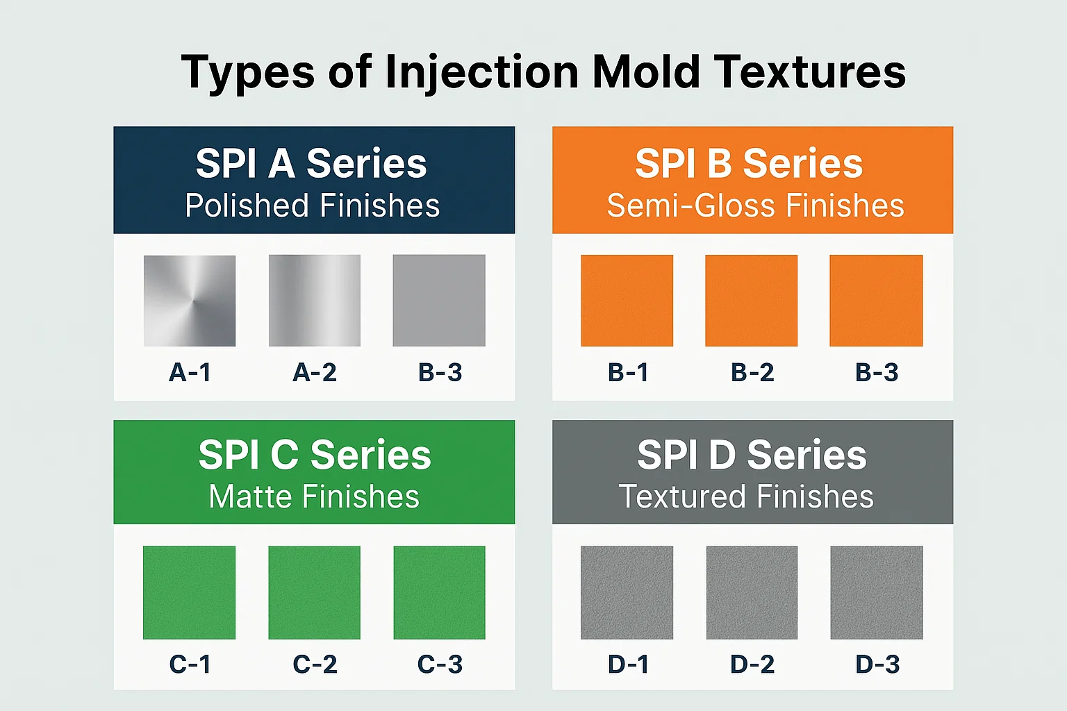 دنیای بافت های قالب تزریق بسیار گسترده است ، اما توسط سیستمی که توسط انجمن صنعت پلاستیک (SPI) ایجاد شده است ، تا حد زیادی استاندارد شده است. درک این استانداردها برای تعیین دقیق دقیق مورد نیاز برای یک قسمت بسیار مهم است.