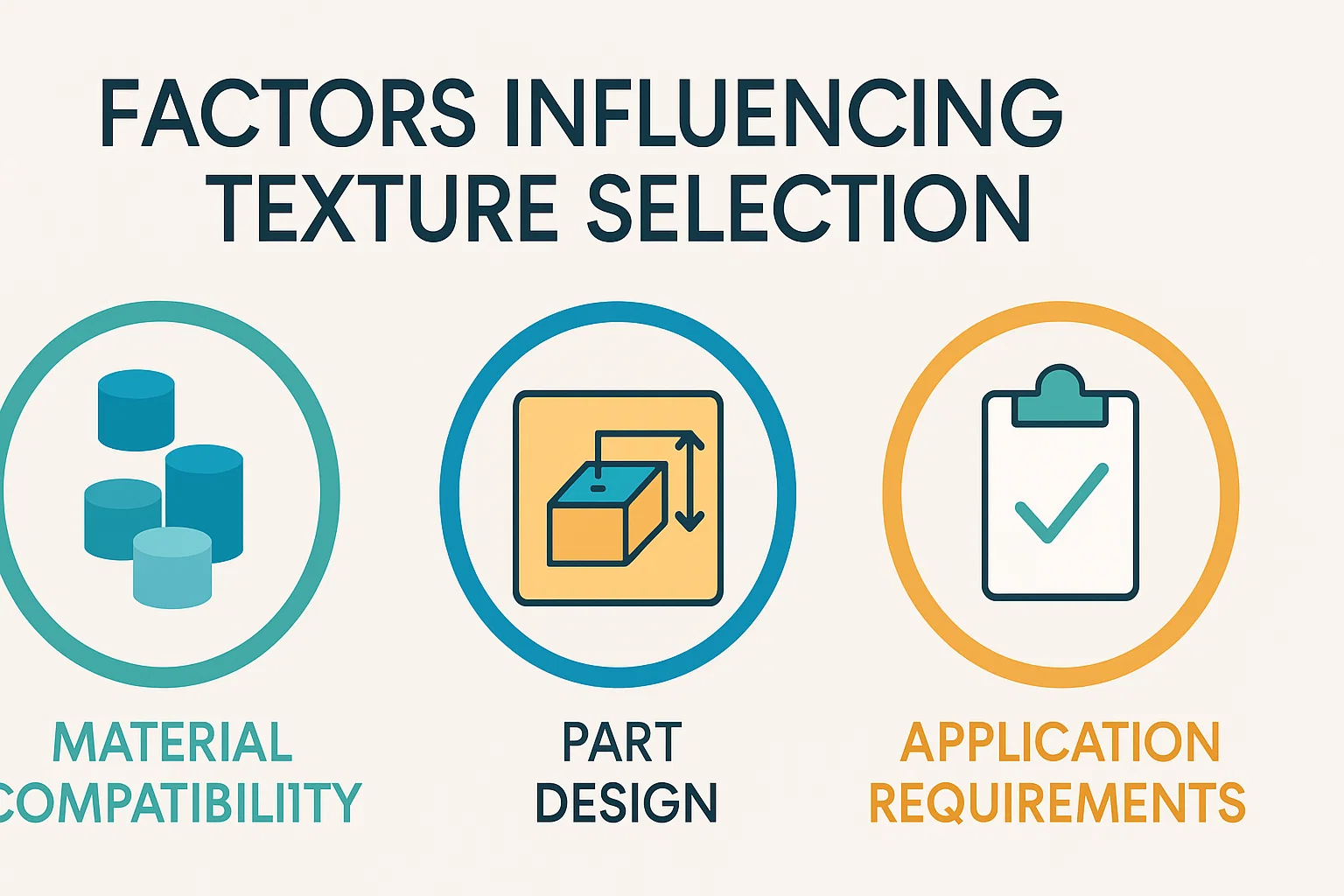 انتخاب بافت قالب مناسب برای بخشی ، یک تصمیم مهم است که زیبایی شناسی ، عملکرد و محدودیت های تولید را متعادل می کند. فرآیند انتخاب به ندرت یک رویکرد یک اندازه متناسب است و به سه عامل اصلی بستگی دارد: مواد قسمت ، طراحی آن و الزامات کاربرد نهایی آن.