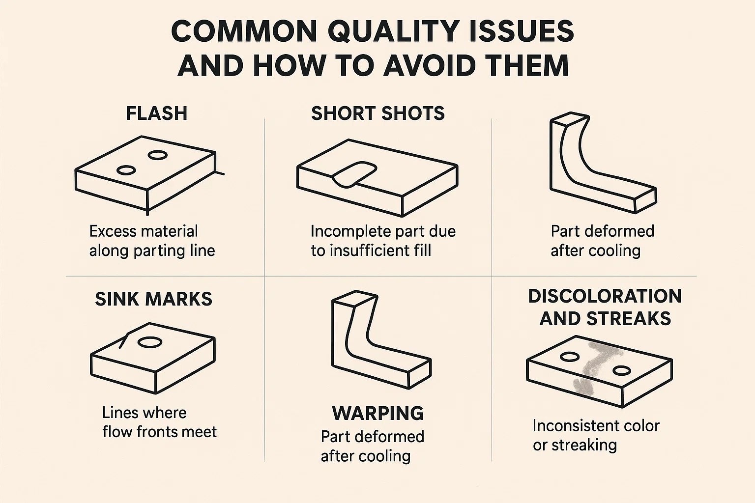 - Maintain Uniform Wall Thickness: This promotes consistent cooling, reduces cycle time, prevents warping and sink marks, and simplifies mold design.